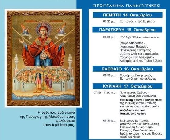 Με την Αναστάσιμη Θεία Λειτουργία, το ιερό μνημόσυνο του Παύλου Μελά και των συναγωνιστών του, καθώς και τη δοξολογία για τον Μακεδονικό Αγώνα κορυφώνονται την προσεχή Κυριακή, 17 Οκτωβρίου, οι λατρευτικές εκδηλώσεις στην Αγία Κυριακή Χαριλάου Θεσσαλονίκης, όπου θησαυρίζεται η εφέστιος Εικόνα της Παναγίας της επικεκλημένης “Μακεδονιτίσσης της των Ελλήνων Δόξα”.