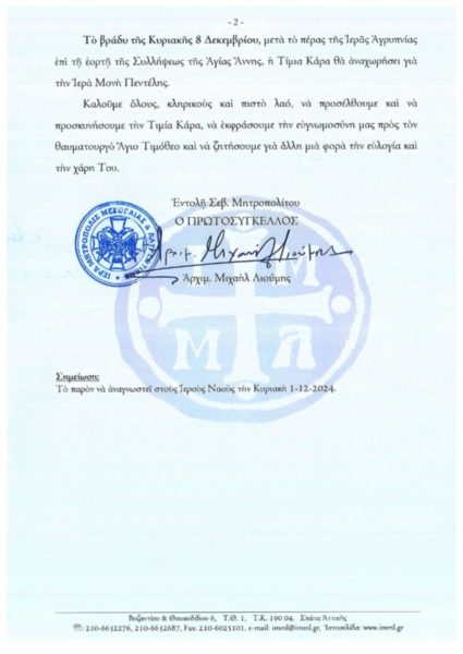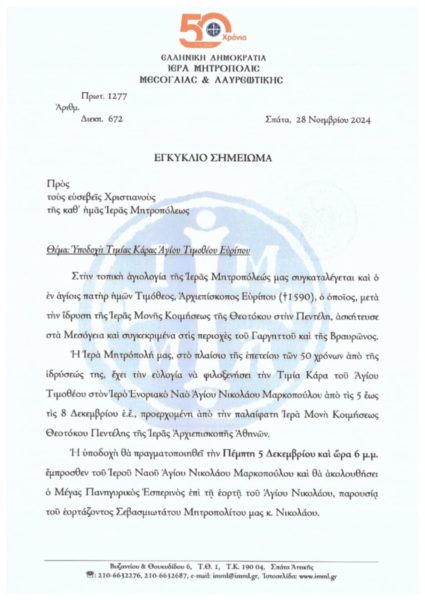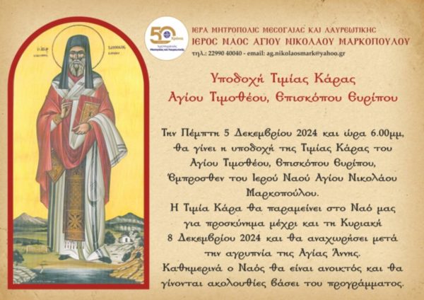 Εξ αφορμής της επετείου των 50 χρόνων από της ιδρύσεως της Ιεράς Μητροπόλεως Μεσογαίας και Λαυρεωτικής, προ της ενάρξεως του Μεγάλου Εσπερινού, έμπροσθεν του Ιερού Ναού, θα πραγματοποιηθεί η υποδοχή της Τιμίας Κάρας του Αγίου Τιμοθέου Επισκόπου Ευρίπου, η οποία θα παραμείνει για προσκύνημα στον Ιερό Ναό έως και την Κυριακή 8 Δεκεμβρίου.