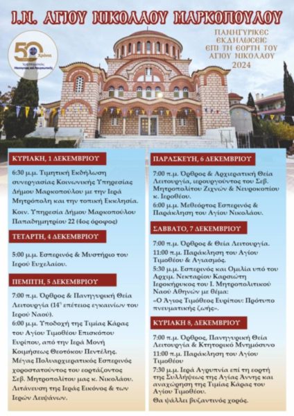 Την Παρασκευή 6 Δεκεμβρίου η Εκκλησία μας εορτάζει τη μνήμη του εν Αγίοις Πατρός ημών Νικολάου Αρχιεπισκόπου Μύρων της Λυκίας του Θαυματουργού. Κατά την ημέρα αυτή πανηγυρίζει ο Ιερός Ενοριακός Ναός Αγίου Νικολάου Μαρκοπούλου Μεσογαίας.