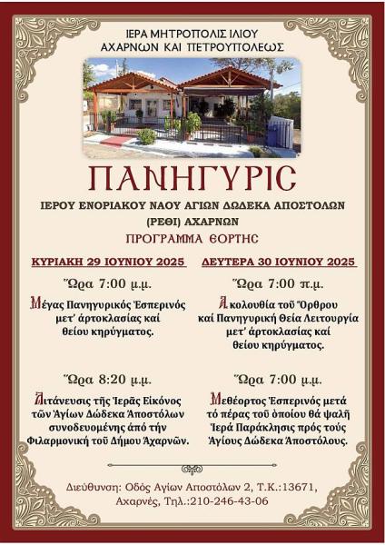 Η πανήγυρις του Ιερού Ναού Αγίων Δώδεκα Αποστόλων στο Ρέθι Αχαρνών θα πραγματοποιηθεί σύμφωνα με το ακόλουθο πρόγραμμα: