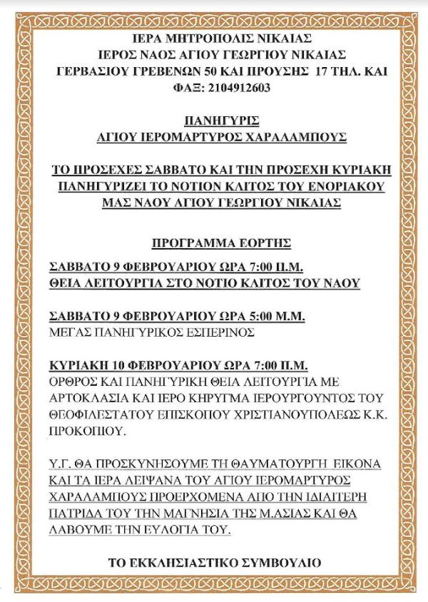 Ανακοίνωση σχετικά με την Πανήγυρη του Αγίου Ιερομάρτυρος Χαραλάμπους εξέδωσε η Ενορία του Αγίου Γεωργίου Νικαίας. Διαβάστε αναλυτικά το πρόγραμμα των λατρευτικών εκδηλώσεων.