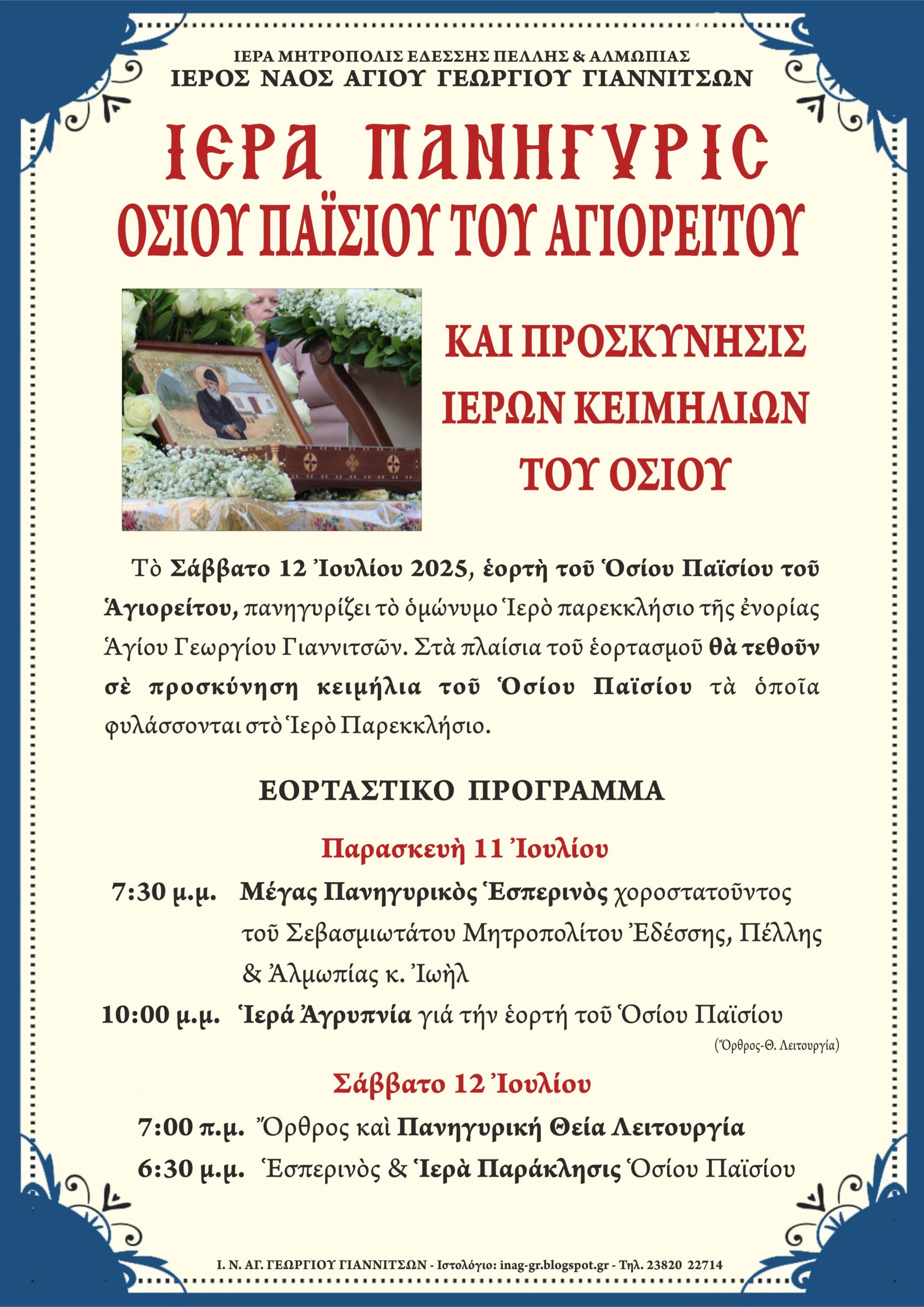 Το Σάββατο 12 Ιουλίου, εορτή του Οσίου Παϊσίου του Αγιορείτου, πανηγυρίζει το ομώνυμο ιερό παρεκκλήσιο της ενορίας Αγίου Γεωργίου Γιαννιτσών. Στα πλαίσια του εορτασμού θα τεθούν σε προσκύνηση κειμήλια του Οσίου Παϊσίου, τα οποία φυλάσσονται στο Ι. Παρεκκλήσιο.