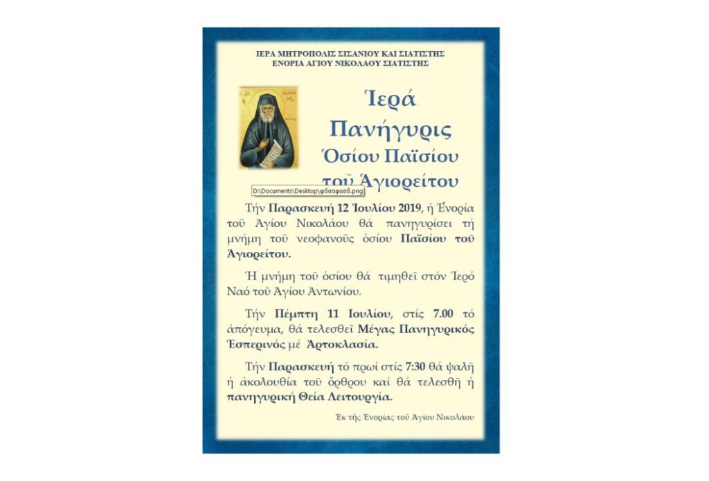 Την Παρασκευή 12 Ιουλίου 2019, η Ενορία Αγίου Νικολάου Σιάτιστας θα πανηγυρίσει τη μνήμη του Αγίου Παϊσίου του Αγιορείτου. Την Πέμπτη 11 Ιουλίου, στις 7.00 το απόγευμα, θα τελεσθεί Μέγας Πανηγυρικός Εσπερινός με Αρτοκλασία.
