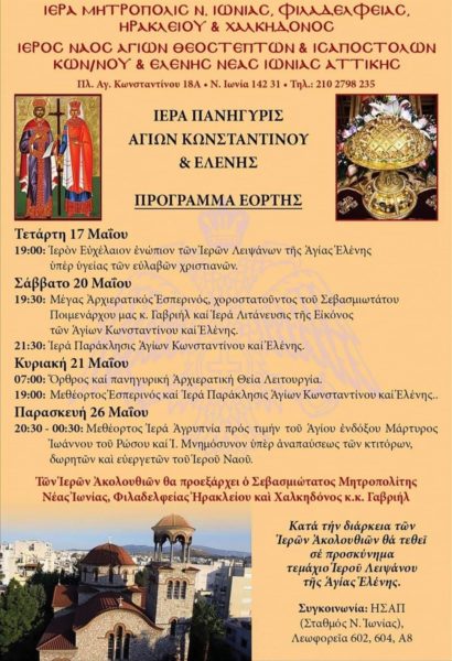 Ξεκίνησαν από χθες, Τετάρτη 17 Μαϊου, οι εόρτιες λατρευτικές εκδηλώσεις στον Ιερό Ναό των Αγίων Κωνσταντίνου και Ελένης στη Νέα Ιωνία Αττικής.