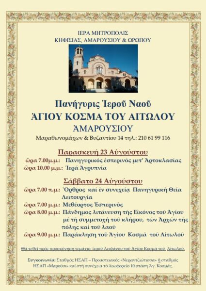 Οι λατρευτικές εκδηλώσεις θα ξεκινήσουν την Παρασκευή 23 Αυγούστου με τον Πανηγυρικό Εσπερινό και θα ολοκληρωθούν το απόγευμα του Σαββάτου 24 Αυγούστου με Ιερά Παράκληση στον Άγιο Κοσμά.