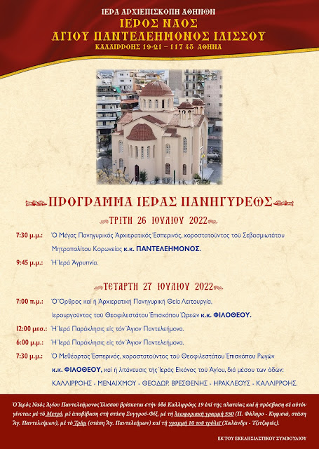 Η Ιερά Ακολουθία της Πανηγύρεως του Ιερού Ναού Αγίου Παντελεήμονος Ιλισσού θα τελεσθεί σήμερα και αύριο.