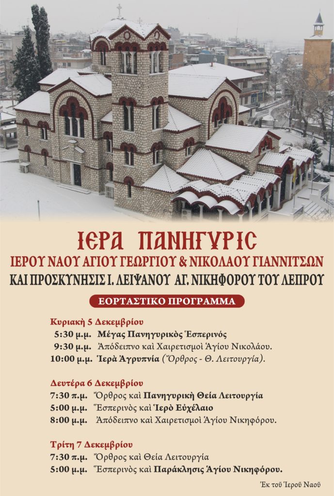 Την Δευτέρα 6 Δεκεμβρίου, πανηγυρίζει ο Ιερός Ναός Αγίου Γεωργίου και Αγ. Νικολάου Γιαννιτσών.