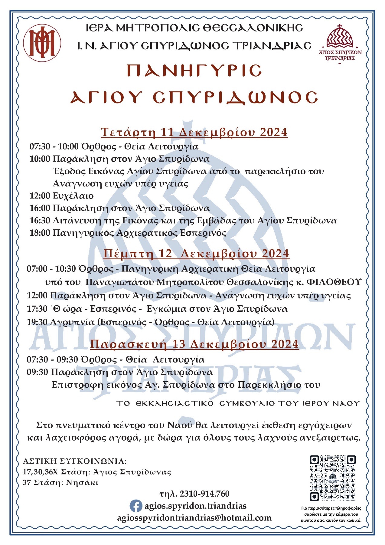 Ακολουθεί το αναλυτικό πρόγραμμα της πανηγύρεως του Αγίου Σπυρίδωνος Τριανδρίας