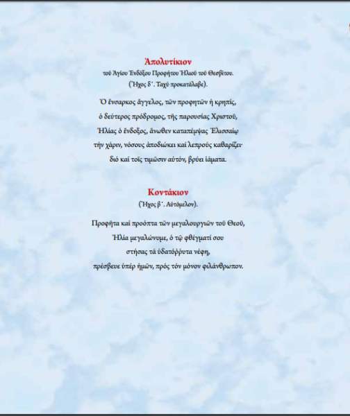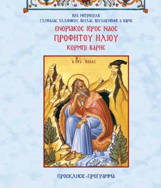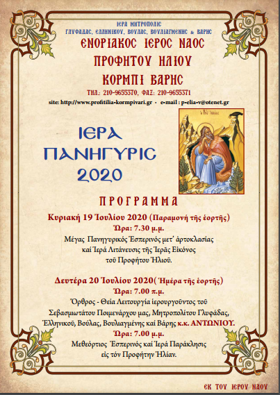 08/07/2020 08/07/2020 Tη Δευτέρα 20 Ιουλίου πανηγυρίζει ο ενοριακός Ιερός  Ναός του Προφήτου Ηλίου στο Κορμπί της Βάρης και κατά τον εορτασμό θα ιερουργήσει ο Σεβασμιώτατος Μητροπολίτης Γλυφάδας, Ελληνικού, Βούλας, Βουλιαγμένης και Βάρης κ. Αντώνιος.  Δείτε την πρόσκληση από τον εφημέριο π. Αντώνιο Χρήστο:  Δείτε την αφίσα με το πρόγραμμα του εορτασμού:
