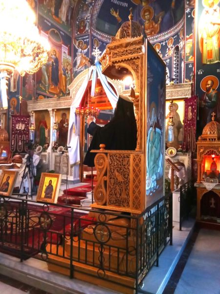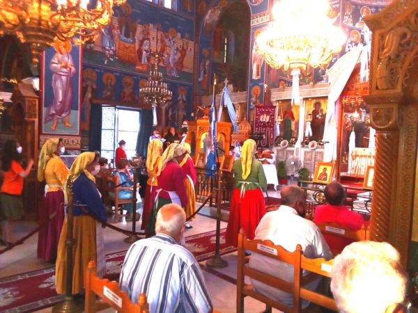 Μέγας Πανηγυρικός Εσπερινός τελέστηκε χοροστατούντος του Θεοφιλεστάτου Επισκόπου Ευρίπου κ.κ. Χρυσοστόμου μετ’ Αρτοκλασίας και Θείου Κηρύγματος. Την Ιερά Εικόνα περιέβαλλαν ευλαβείς ενορίτες ντυμένοι με παραδοσιακές νησιώτικες φορεσιές.