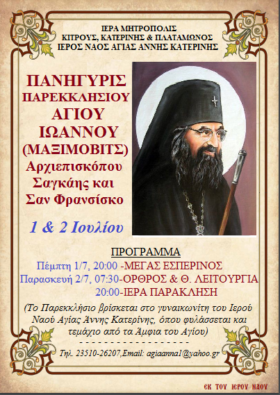 ΙΕΡΟΣ ΝΑΟΣ ΑΓΙΑΣ ΑΝΝΗΣ ΚΑΤΕΡΙΝΗΣ – Πανηγυρίζει το Παρεκκλήσιο του Αγίου Ιωάννου Μαξίμοβιτς την 1η και 2α Ιουλίου. Την Πέμπτη 1 Ιουλίου θα τελεσθεί Μέγας Πανηγυρικός Εσπερινός και την Παρασκευή Πανηγυρική Θεία Λειτουργία.