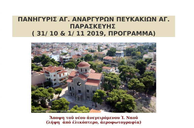 Πανηγυρίζει, κατά την Πέμπτη – Παρασκευή, 31 Οκτωβρίου – 01 Νοεμβρίου 2019, το Ιερόν Παρεκκλήσιον των Αγίων Αναργύρων Πευκακίων Δήμου Αγίας Παρασκευής Αττικής.
