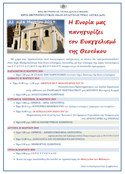 Πανηγυρικές ἐκδηλώσεις θά πραγματοποιηθοῦν στόν Ἱερό Μητροπολιτικό Ναό Εὐαγγελιστρίας Λευκάδος, μέ τήν εὐκαιρία τῆς ἱερᾶς πανηγύρεως τοῦ Ε Υ Α Γ Γ Ε Λ Ι Σ Μ Ο Υ τῆς Θ Ε Ο Τ Ο Κ Ο Υ, σύμφωνα μέ τό ἀκόλουθο πρόγραμμα: