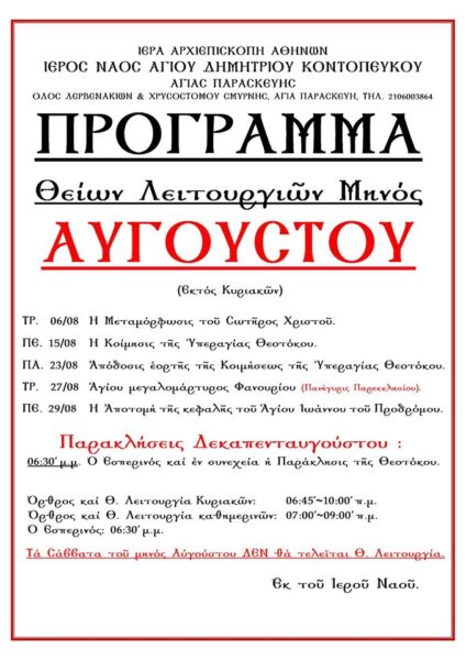 Κάθε ημέρα, κατά τον Δεκαπενταύγουστο 2019, θα λαμβάνουν χώρα ο Εσπερινός και εν συνεχεία οι Ιερές Παρακλήσεις προς την Υπεραγία Θεοτόκο στον Ιερό Ναό Αγίου Δημητρίου Κοντοπεύκου Αγίας Παρασκευής Αττικής, ώρα 6.30 της εσπέρας, συμφώνως με το παρακάτω επισυναπτόμενο Πρόγραμμα.