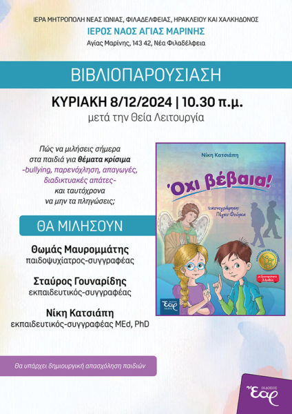 Στο φιλόξενο πνευματικό κέντρο του Ι. Ν. Αγίας Μαρίνας Φιλαδέλφειας έγινε την Κυριακή 8 Δεκεμβρίου μια ενδιαφέρουσα ομιλία με αφορμή το βιβλίο «Όχι βέβαια» των εκδόσεων Έαρ και με τη συμμετοχή δεκάδων γονέων που κατέκλυσαν από νωρίς την αίθουσα.