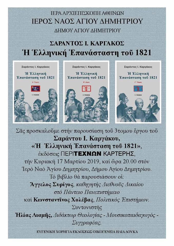 Παρουσίαση του τρίτομου έργου, του πρόσφατα εκλιπόντος Σαράντου Καργάκου, “Η Ελληνική Επανάσταση του 1821” θα πραγματοποιηθεί την Κυριακή 17 Μαρτίου και ώρα 20:00 στο Ιερό Ναό του Αγίου Δημητρίου του ομωνύμου Δήμου. Για το έργο του κορυφαίου ιστορικού θα μιλήσουν οι Άγγελος Συρίγος, Καθηγητής Διεθνούς Δικαίου στο Πάντειο Πανεπιστήμιο και Κωνσταντίνος Χολέβας, Πολιτικός Επιστήμων. Την εκδήλωση θα συντονίσει ο κ. Ηλίας Λιαμής, Δρ. Θεολογίας – Μουσικοδιδάσκαλος – Συγγραφέας.