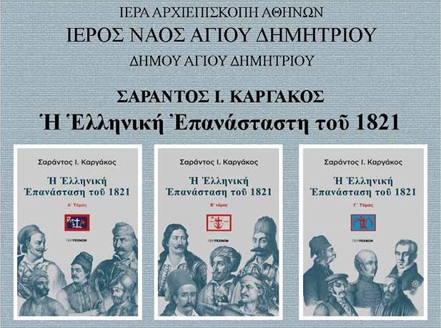 Παρουσίαση του τρίτομου έργου, του πρόσφατα εκλιπόντος Σαράντου Καργάκου, “Η Ελληνική Επανάσταση του 1821” θα πραγματοποιηθεί την Κυριακή 17 Μαρτίου και ώρα 20:00 στο Ιερό Ναό του Αγίου Δημητρίου του ομωνύμου Δήμου. Για το έργο του κορυφαίου ιστορικού θα μιλήσουν οι Άγγελος Συρίγος, Καθηγητής Διεθνούς Δικαίου στο Πάντειο Πανεπιστήμιο και Κωνσταντίνος Χολέβας, Πολιτικός Επιστήμων. Την εκδήλωση θα συντονίσει ο κ. Ηλίας Λιαμής, Δρ. Θεολογίας – Μουσικοδιδάσκαλος – Συγγραφέας.