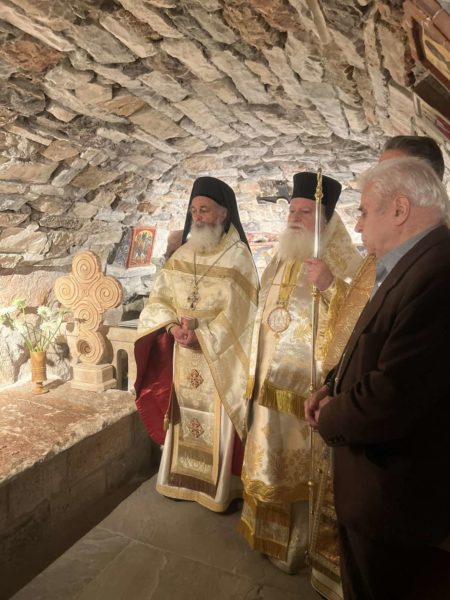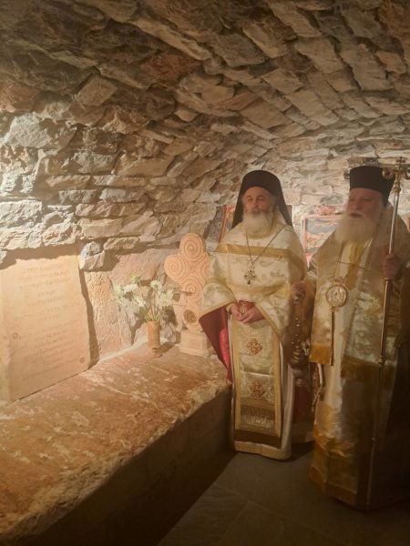Μετά το πέρας της Αρχιερατικής Θείας Λειτουργίας και του Πενταετούς Μνημοσύνου εψάλη Τρισάγιο στον τάφο του αοιδίμου Αρχιμανδρίτου, στον ειδικά διαμορφωμένο χώρο σε ένα από τα υπόγεια παρεκκλήσια του Ναού. Είη η μνήμη του αιωνία και άληστος.
