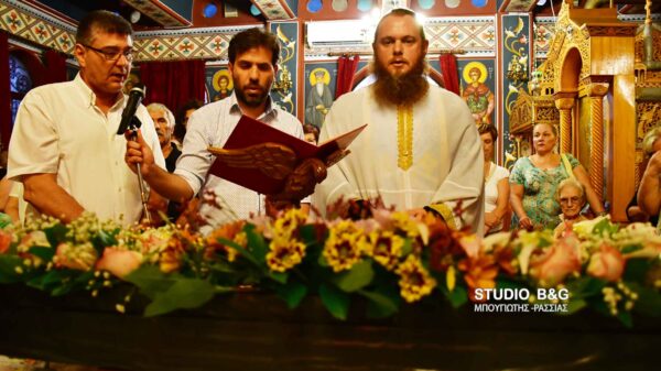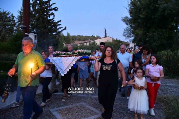 Τις Ιερές ακολουθίες τέλεσε ο εφημέριος του ναού π. Βασίλειος Γκολέμης , ενώ χαρακτηριστικής ακουστικής μελωδίας ήταν τα εγκώμια προς την Υπεραγία Θεοτόκο που ψάλλονται με επτανησιακό χρώμα, από τους ψάλτες του ναού και την χορωδία από γυναίκες της περιοχής. Κατά την διάρκεια των εγκωμίων και την ώρα που ο Ιερέας ψάλλει το «έραναν τον τάφο» , μικρά παιδιά έραναν την εικόνα της Παναγίας λουλούδια.