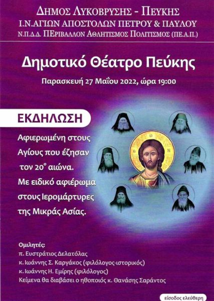Εκδήλωση, η οποία θα είναι αφιερωμένη στους Αγίους που έζησαν τον 20ο αιώνα, με ειδικό αφιέρωμα στους Ιερομάρτυρες της Μικράς Ασίας, διοργανώνει η Ενορία των Αγίων Πέτρου και Παύλου Πεύκης την Παρασκευή 27 Μαΐου στις 19:00, στο Δημοτικό Θέατρο Πεύκης.