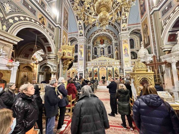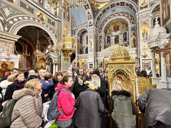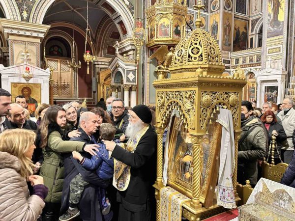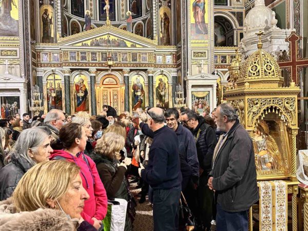 Οι πιστοί περνούν συνέχεια από το πρωί μέχρι το βράδυ για να πάρουν την ευλογία από τα Ιερά Σεβάσματα που θα παραμείνουν στην Αθήνα μέχρι και τις 28 Ιανουαρίου 2024.