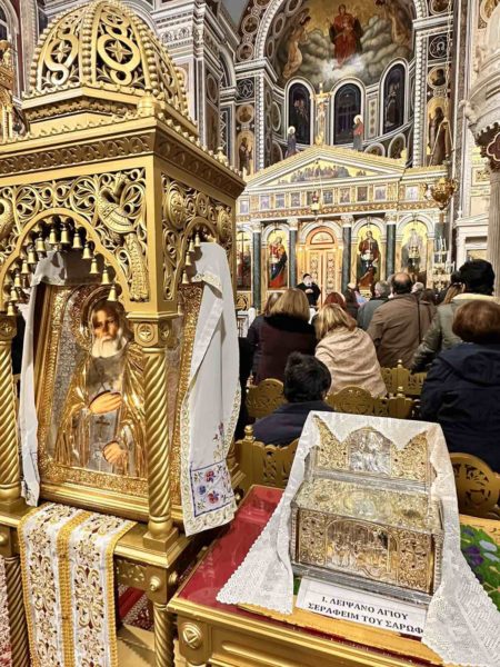 Πλήθος πιστών αψηφώντας το τσουχτερό κρύο που επικρατεί αυτές τις ημέρες στην Αττική, περνούν κατά τη διάρκεια της ημέρας από τον Ιερό Ναό Αγίων Κωνσταντίνου και Ελένης Πειραιώς απέναντι από το Δημοτικό Θέατρο του Πειραιά, για να προσκυνήσουν την θαυματουργή εικόνα και τα Ιερά Λείψανα του Αγίου Σεραφείμ του Σάρωφ.