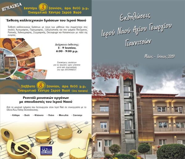 Η Ενορία Αγίου Γεωργίου Γιαννιτσών θα πραγματοποιήσει από 12 Μαΐου έως 8 Ιουνίου 2019 πολιτιστικές εκδηλώσεις με βάση τις δράσεις που επιτελούνται στο Πνευματικό Κέντρο της, “Άγιος Παΐσιος ο Αγιορείτης”. Για να κατεβάσετε το αναλυτικό πρόγραμμα πατήστε εδώ