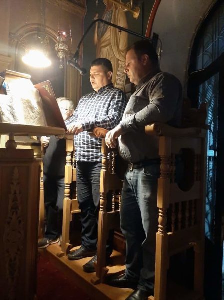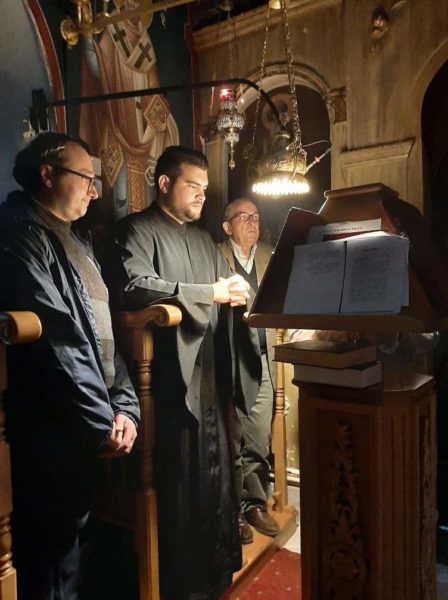 Τους ύμνους της αγρυπνίας απέδωσαν ο Πρωτοψάλτης του Ιερού Ναού Αγίου Γεωργίου κ. Χαράλαμπος Μαζαράκης με τον Ιεροψάλτη του Ιερού Ναού Αγίου Νικόλαου Ερέτριας, κ. Δημήτριο Πετρογιάννη και εξ αριστερών ο Αναγνώστης-Ιεροψάλτης του Ιερού Ναού Ευαγγελισμού της Θεοτόκου Περιβολίων, κ. Αναστάσιος Ρέτσας.