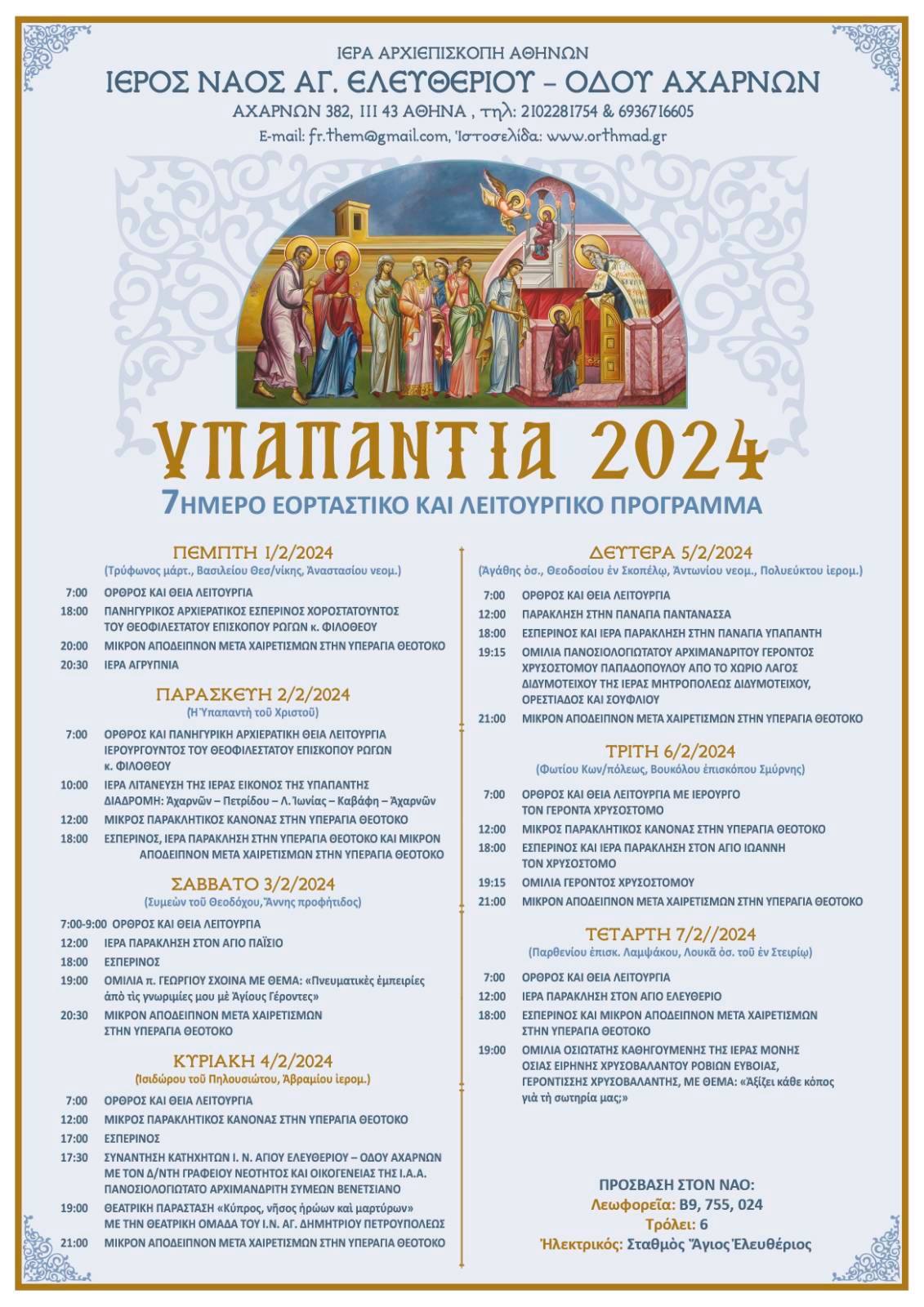 Με ανακοίνωση του ο Ιερός Ναός Ναός Αγίου Ελευθερίου οδού Αχαρνών γνωστοποιεί το φετινό 7ήμερο εορταστικό και λειτουργικό πρόγραμμα για τα «ΥΠΑΠΑΝΤΙΑ 2024».