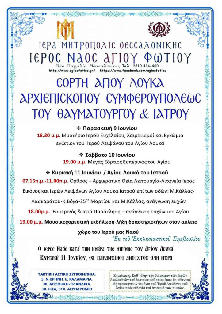 Με αφορμή την επικείμενη εορτή του Αγίου Λουκά, Αρχιεπισκόπου Συμφερουπόλεως του Θαυματουργού και ιατρού, στον Ιερό Ναό Αγίου Φωτίου στη Νέα Παραλία Θεσσαλονίκης, την Παρασκευή 9 Ιουνίου θα τελεσθούν το Μυστήριο του Ιερού Ευχελαίου, οι Χαιρετισμοί και τα Εγκώμια ενώπιον του Ιερού Λειψάνου του Αγίου.