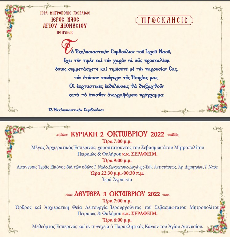 Διήμερες λατρευτικές εκδηλώσεις θα λάβουν χώρα στον Ιερό Ναό Αγίου Διονυσίου Αρεοπαγίτου Πειραιώς στα πλαίσια του εορτασμού του Προστάτη Αγίου της Ενορίας.