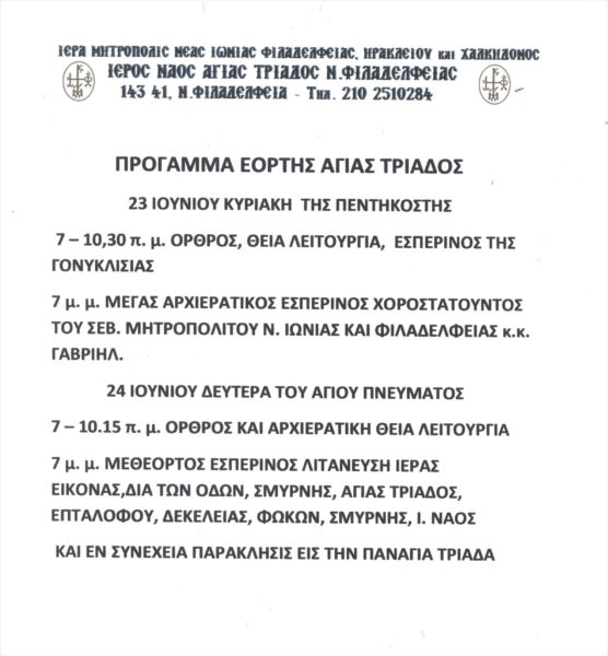 Πρόγραμμα πανηγύρεως Ιερού Ναού Αγίας Τριάδος Νέας Φιλαδελφείας