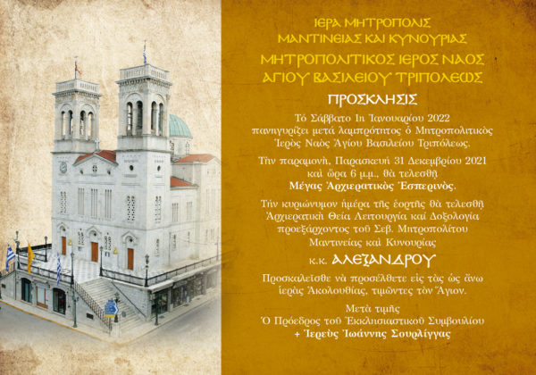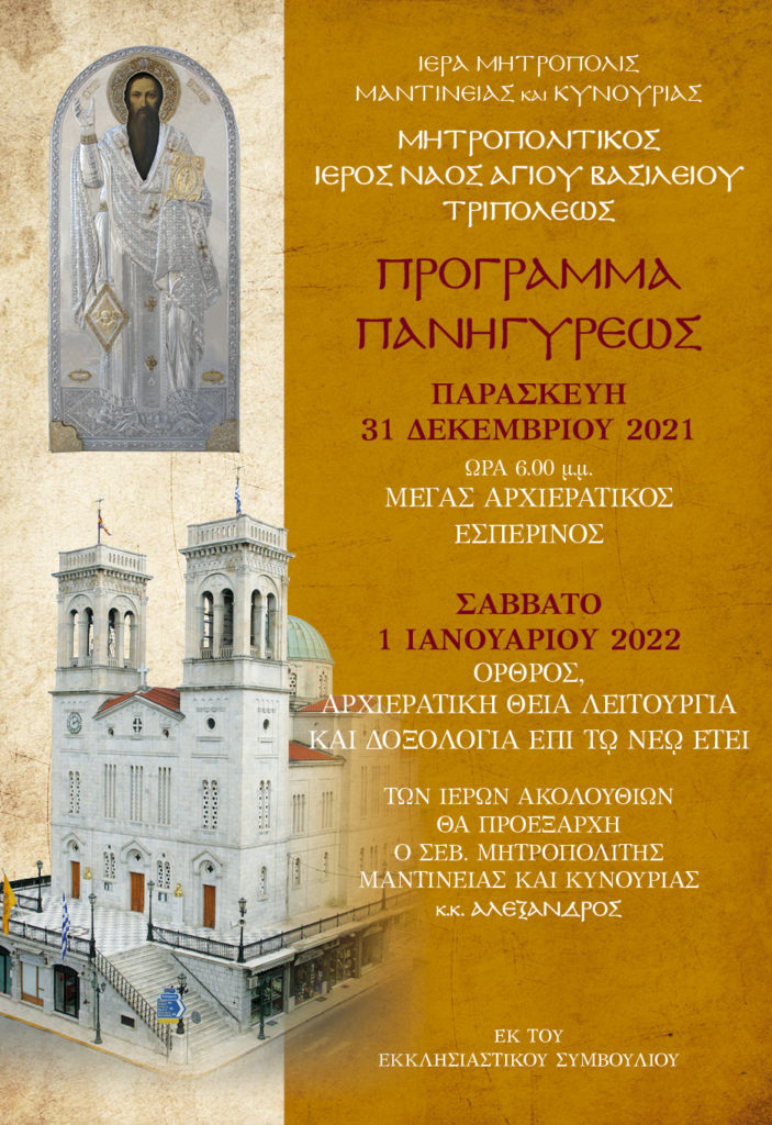 Ο Μητροπολιτικός Ιερός Ναός Αγίου Βασιλείου Τριπόλεως πανηγυρίζει το Σάββατο 1η Ιανουαρίου 2022, και για αυτό οι πιστοί προσκαλούνται να προσέλθουν για να τιμήσουν τον Άγιο.