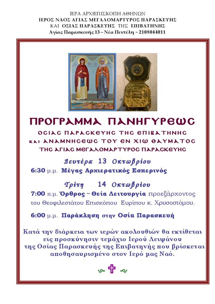 Την ανάμνηση του εν Χίω θαύματος της Αγίας Οσιομάρτυρος Παρασκευής αλλά και την Οσία Παρασκευή την Επιβατινή εορτάζει η Εκκλησία μας στις 14 Οκτωβρίου 2025. Με την αφορμή αυτή ο Ιερός Ναός Αγίας Παρασκευής Επιβατινής Νέας Πεντέλης εξέδωσε το κάτωθι πρόγραμμα της πανηγύρεως: