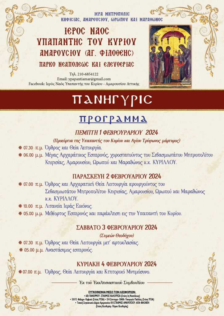 Πρόγραμμα πανηγύρεως του Ιερού Ναού Υπαπαντής του Κυρίου Αμαρουσίου