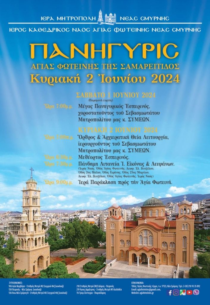 Την Κυριακή, 2 Ιουνίου 2024 πανηγυρίζει ο Ιερός Μητροπολιτικός Ναός Αγίας Φωτεινής Νέας Σμύρνης.