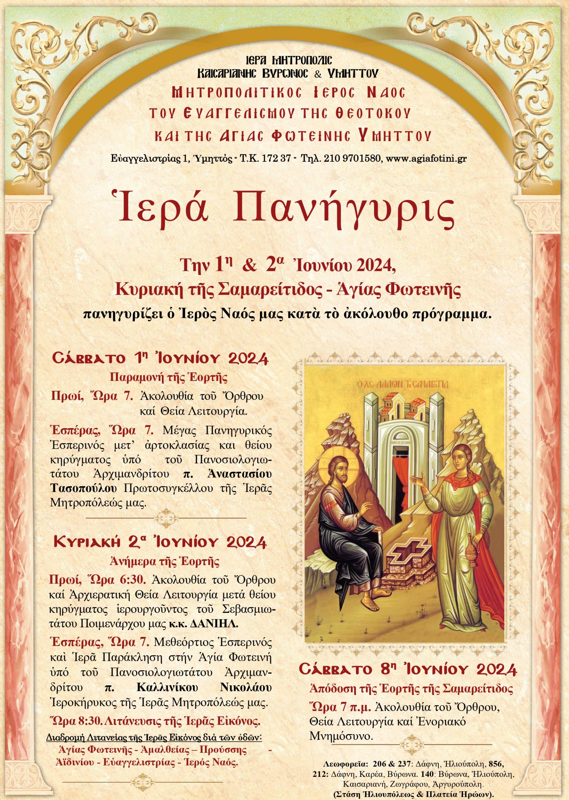 Την 1η και την 2α Ιουνίου 2024, Κυριακή της Σαμαρείτιδος – Αγίας Φωτεινής πανηγυρίζει ο Μητροπολιτικός Ιερός Ναός του Ευαγγελισμού της Θεοτόκου και της Αγίας Φωτεινής Υμηττού.