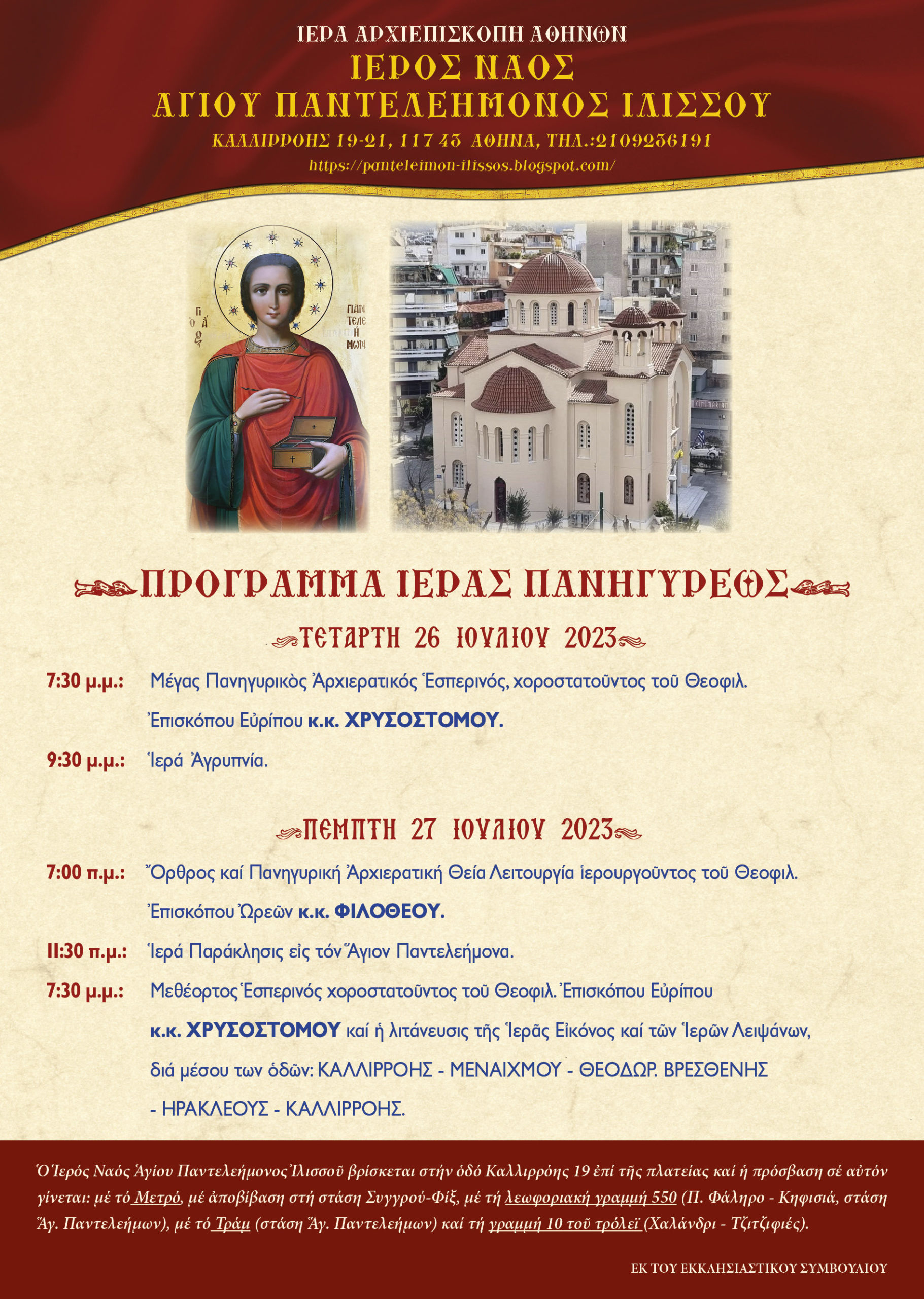 Πανηγυρίζει ο Ιερός Ναός Αγίου Παντελεήμονος Ιλισσού την Πέμπτη 27 Ιουλίου ημνέρα κατά την οποία η Εκκλησία τιμά την μνήμη του Αγίου Παντελεήμονος του Μεγαλομάρτυρος και Ιαματικού. Ο Επίσκοπος Ωρεών κ. Φιλόθεος θα τελέσει τον Όρθρο και την Πανηγυρική Θεία Λειτουργία.