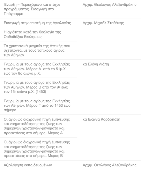 Με ιδιαίτερη επιτυχία ξεκίνησε την Δευτέρα, 16 Μαΐου στις 7:00μ.μ. στον ιερό ναό Αγίου Ελευθερίου οδού Αχαρνών, το επιμορφωτικό πρόγραμμα «ΟΙ ΑΓΙΟΙ ΤΩΝ ΑΘΗΝΩΝ. ΠΡΟΣΩΠΑ ΚΑΙ ΠΟΛΙΤΙΣΤΙΚΑ ΜΝΗΜΕΙΑ ΤΗΣ ΕΚΚΛΗΣΙΑΣΤΙΚΗΣ ΙΣΤΟΡΙΑΣ ΤΗΣ ΑΘΗΝΑΣ ΚΑΙ ΤΑ ΜΗΝΥΜΑΤΑ ΤΟΥΣ ΣΤΗ ΣΥΓΧΡΟΝΗ ΚΟΙΝΩΝΙΑ» που υλοποιείται από το Ίδρυμα Ποιμαντικής Επιμορφώσεως της Ιεράς Αρχιεπισκοπής Αθηνών στο πλαίσιο της συγχρηματοδοτούμενης Πράξης «Προγράμματα Διά Βίου Μάθησης του Ανθρώπινου Δυναμικού της Εκκλησίας – Ανάπτυξη Ανοιχτών Διαδικτυακών Μαθημάτων» (κωδικός ΟΠΣ 5073422) του επιχειρησιακού προγράμματος «Ανάπτυξη Ανθρώπινου Δυναμικού, Εκπαίδευση και Δια Βίου Μάθηση 2014-2020».