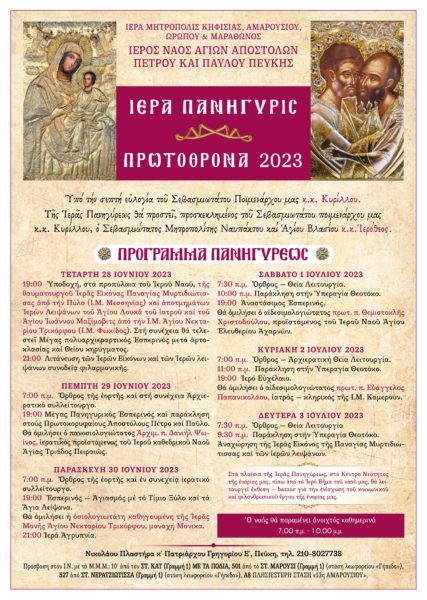 Από την Τετάρτη 28 Ιουνίου έως τη Δευτέρα 3 Ιουλίου θα διαρκέσουν οι εόρτιες λατρευτικές εκδηλώσεις “ΠΡΩΤΟΘΡΟΝΑ 2023”, στην ενορία των Αγίων Αποστόλων Πέτρου και Παύλου Πεύκης.