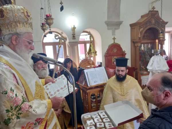 Η ακολουθία τελέστηκε στον Ιερό Ναό του Αγίου Γεωργίου, καθώς ο κεντρικός ναός του Αγίου Αντωνίου έχει υποστεί ζημιές από τον καταστροφικό σεισμό της 27ης Σεπτεμβρίου 2021. Στη Θεία Λειτουργία έλαβαν μέρος ο εφημέριος του Ναού, Πρωτ. Γεώργιος Μαραυγάκης, ο Οικονόμος Ιωάννης Καπελλάκης και ο Αρχιδιάκονος Μαρίνος Δασκαλάκης.