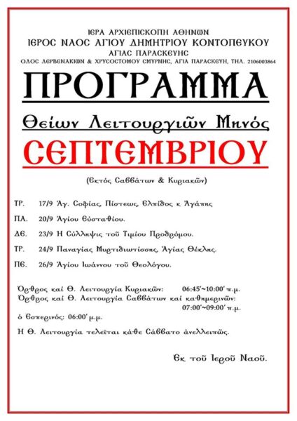 Πρόγραμμα Θείων Λειτουργιών Μηνός Σεπτεμβρίου 2019 εκ μέρους της Ενορίας Ιερού Ναού Αγίου Δημητρίου Κοντοπεύκου Αγίας Παρασκευής, καθώς αυτό επισυνάπτεται παρακάτω: