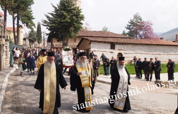 Μετά τη Θεία Λειτουργία ήλθε στον Ναό ο Σεβασμιώτατος Μητροπολίτης Καστοριάς κ. κ. Σεραφείμ, ο οποίος μαζί με τους ιερείς και πλήθος πιστών προέπεμψαν την Αγία εικόνα της Παναγίας Ελεούσας της Μονής Μικροκάστρου στη έξοδο της πόλης, στο κοιμητήριο του Αγίου Νικάνορα.