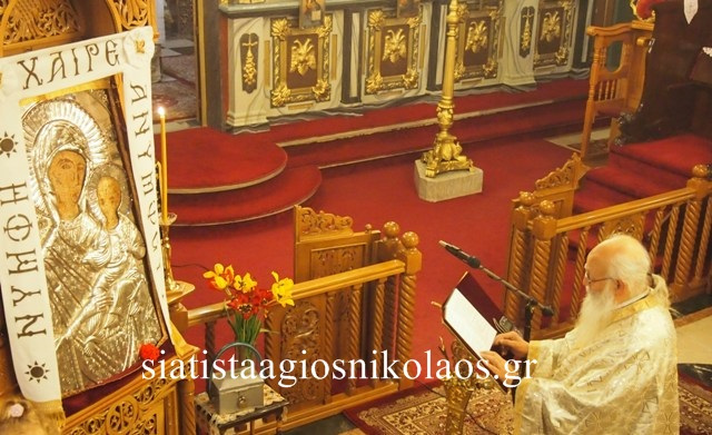 Οι ιεροψάλτες έψαλαν τα τροπάρια του κανόνα και ο πρωτοπρεσβύτερος Βασίλειος Λ. Βασιλείου έψαλε τους 24 οίκους του Ακαθίστου Ύμνου ενώπιον της Ιεράς και θαυματουργής εικόνας της Παναγίας της Ελεούσας από την Ιερά Μονή Κοιμήσεως της Θεοτόκου Μικροκάστρου. Πλήθος πιστών άκουγαν και συνέψαλαν τους ύμνους και τους οίκους, και στο τέλος προσκύνησαν την θαυματουργή εικόνα της Παναγίας.