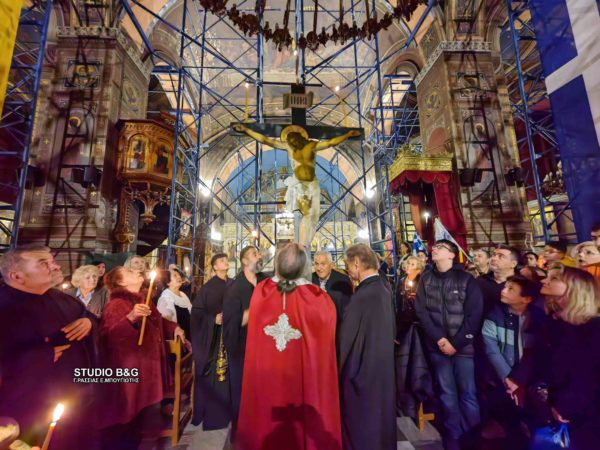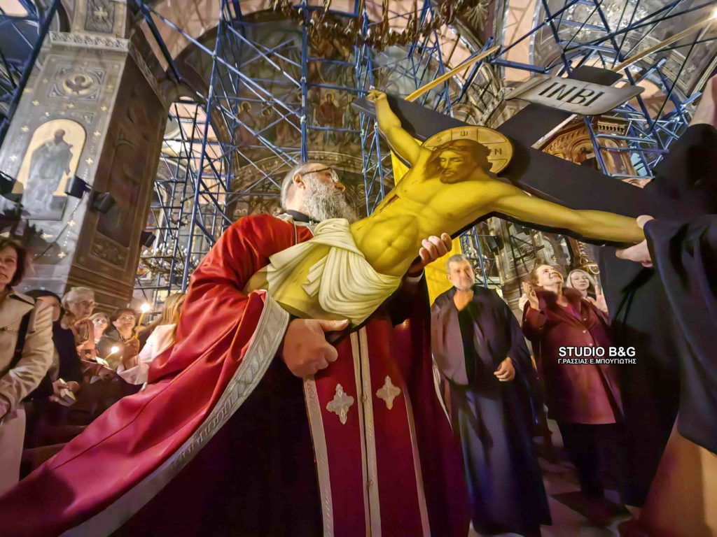 Στον Μητροπολιτικό Ιερό Ναό του Αγίου Γεωργίου σε κατανυκτική ατμόσφαιρα ο Ιερέας του ναού π. Παναγιώτης Κιντής ψάλλοντας το «σήμερον κρεμάται επί ξύλου», περιέφερε τον Εσταυρωμένο και τον τοποθετεί στο κέντρο του ναού.