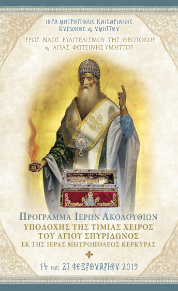 Ὥρα 11:00 π.μ. Ἱερά Παράκλησις εἰς τόν Ἅγιον Σπυρίδωνα καί τέλεσις τοῦ Μικροῦ Ἁγιασμοῦ διά τῆς Χειρός τοῦ Ἁγίου Σπυρίδωνος. Θά προστῇ καί θά ὁμιλήσῃ ὁ ΠανοσιολογιώτατοςἈρχιμανδρίτης π. Καλλίνικος Νικολάου, Ἱεροκήρυξ τῆς Ἱερᾶς Μητροπόλεώς μας.