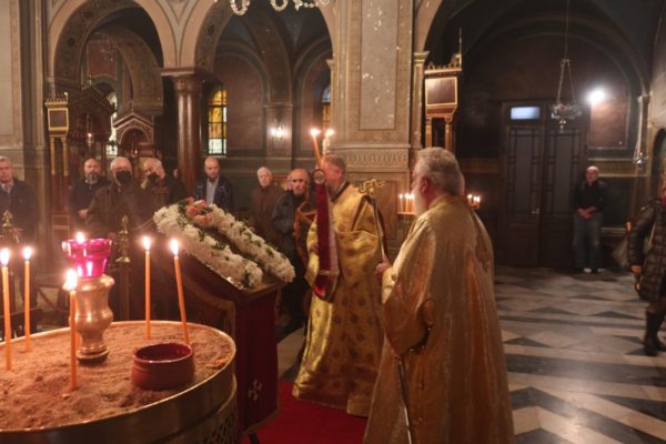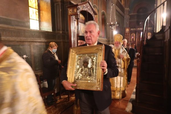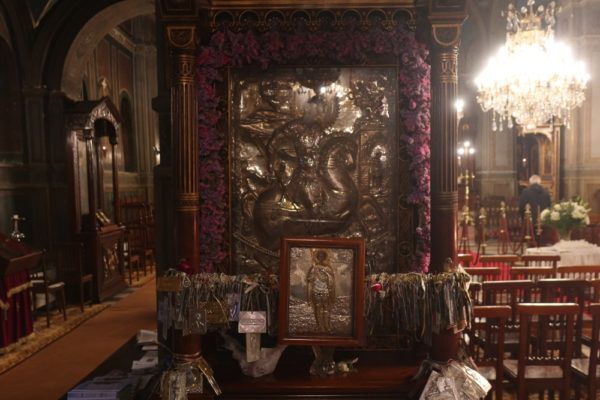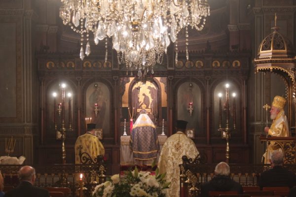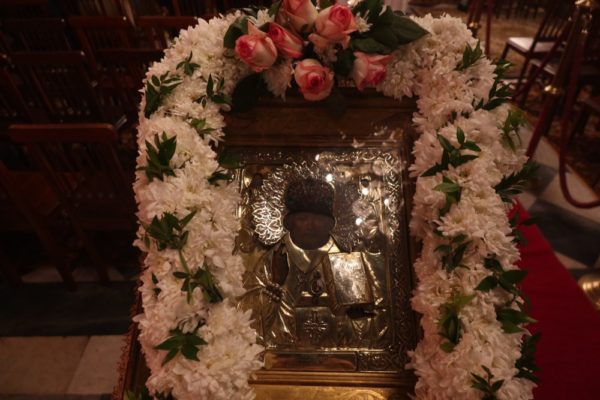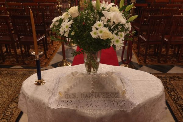 Στη συνέχεια, τελέσθηκε μικρή λιτανεία, εντός του Ναού, της μεταφερθείσας από την Ερμούπολη ιεράς Εικόνος του Αγίου Νικολάου και μνημόσυνο των αποβιωσάντων Προέδρων και μελών του Φιλολογικού Συλλόγου «Παρνασσός», τον Πρόεδρο του οποίου ο Σεβασμιώτατος ιδιαιτέρως συνεχάρη.