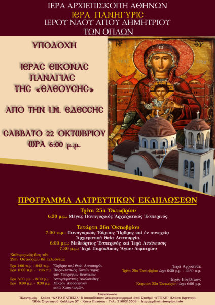 Υπό την σεπτή αδεία και ευλογία του Μακαριωτάτου Αρχιεπισκόπου Αθηνών και Πάσης Ελλάδος κ.κ. Ιερωνύμου, θα τελεστεί το Σάββατο 22 Οκτωβρίου 2022, στις 6 το απόγευμα, η πάνδημος Υποδοχή της θαυματουργής εικόνας της Θεομήτορος, έμπροσθεν του πανηγυρίζοντα ιστορικού Ιερού Ναού του Αγίου Δημητρίου των Όπλων, επί της οδού Στρατηγού Καλλάρη, στα Κάτω Πατήσια.