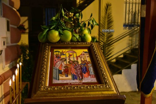 Το απόγευμα της παραμονής της εορτής, τη Δευτέρα 20 Νοεμβρίου 2023, τελέσθηκε Μέγας Πανηγυρικός Εσπερινός μετά θείου κηρύγματος ιερουργούντος του Ιεροκήρυκα της Ιεράς Μητροπόλεως Αργολίδος Αρχιμανδρίτη Χρυσοστόμου Παπουλέση και εν συνεχεία ακολούθησε περιφορά της Ιεράς Εικόνας.