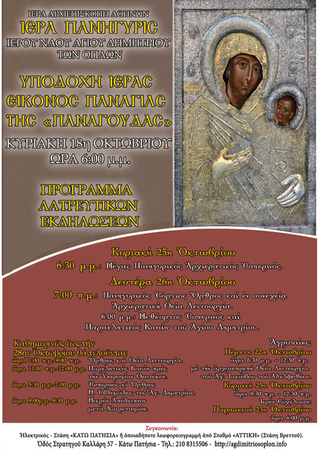 Την Κυριακή, 18η Οκτωβρίου και ώρα 6.00 μ.μ., στον Ι. Ναό Αγίου Δημητρίου των Όπλων, στα Κάτω Πατήσια (οδ. Στρατηγού Καλλάρη 57), θα πραγματοποιηθεί η επίσημη υποδοχή της Ιεράς και Θαυματουργού Εικόνος της «Παναγίας της Παναγούδας», η οποία θα παραμείνει έως και την Τετάρτη 28 Οκτωβρίου.